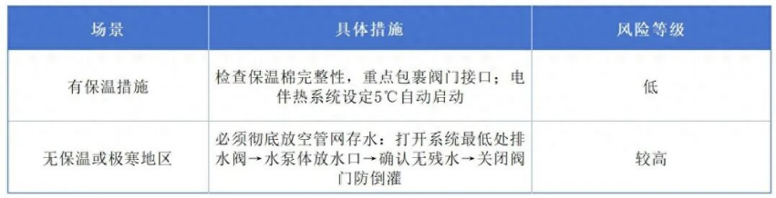 關鍵細節:放空后水泵必須保持自動狀態。一旦探測到火情,系統可立即自動啟泵、開閥。雖然管網無水會延遲幾秒出水,但總比凍裂后完全失效強。